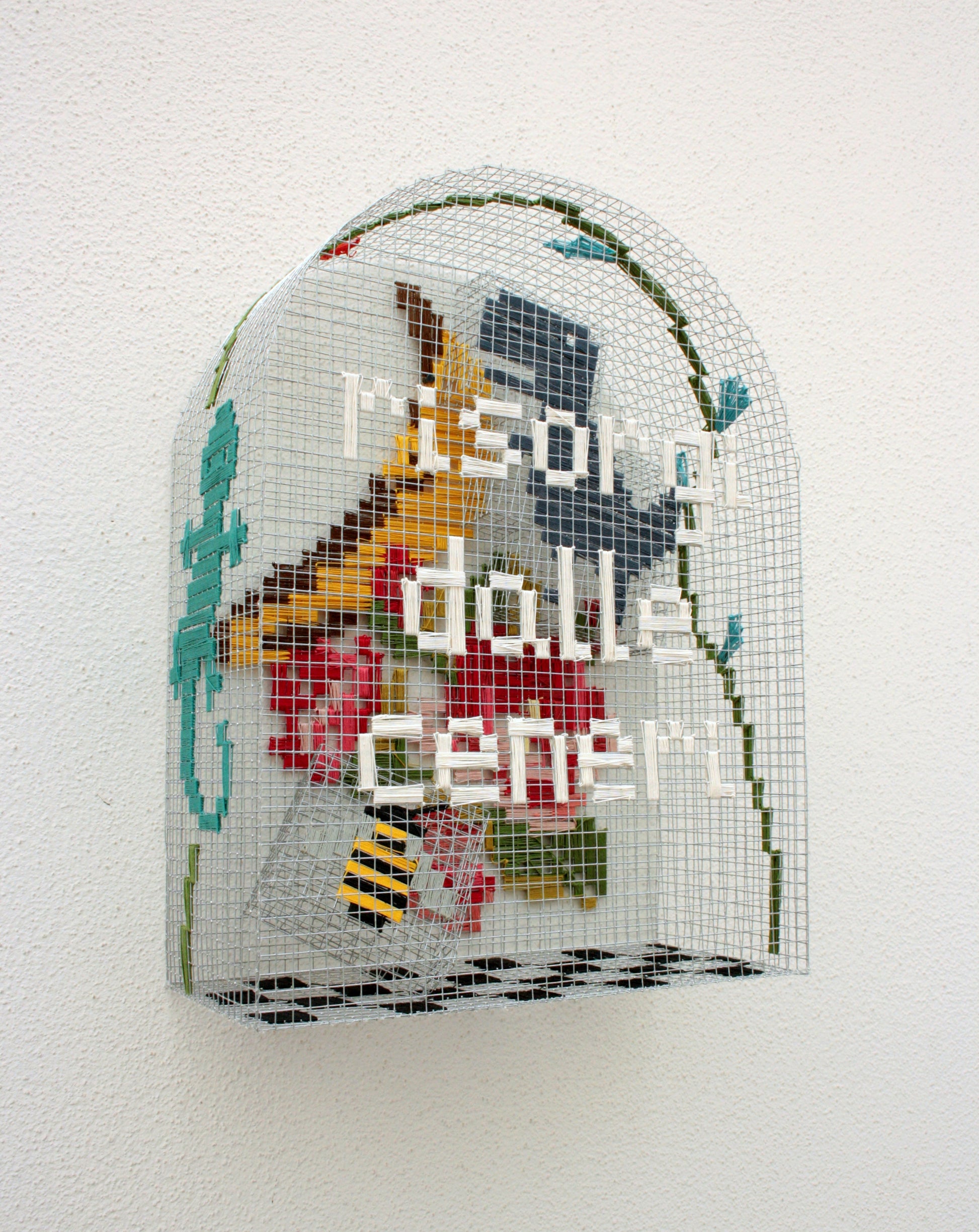 Pansy cage series 33.5 x 25.5 x 11 cm., metal mesh and cotton thread.