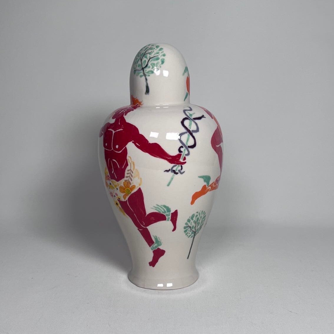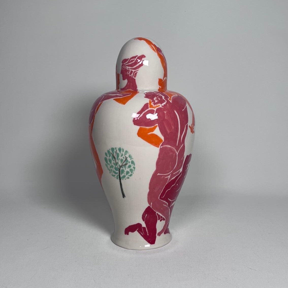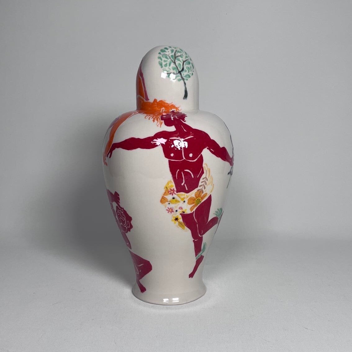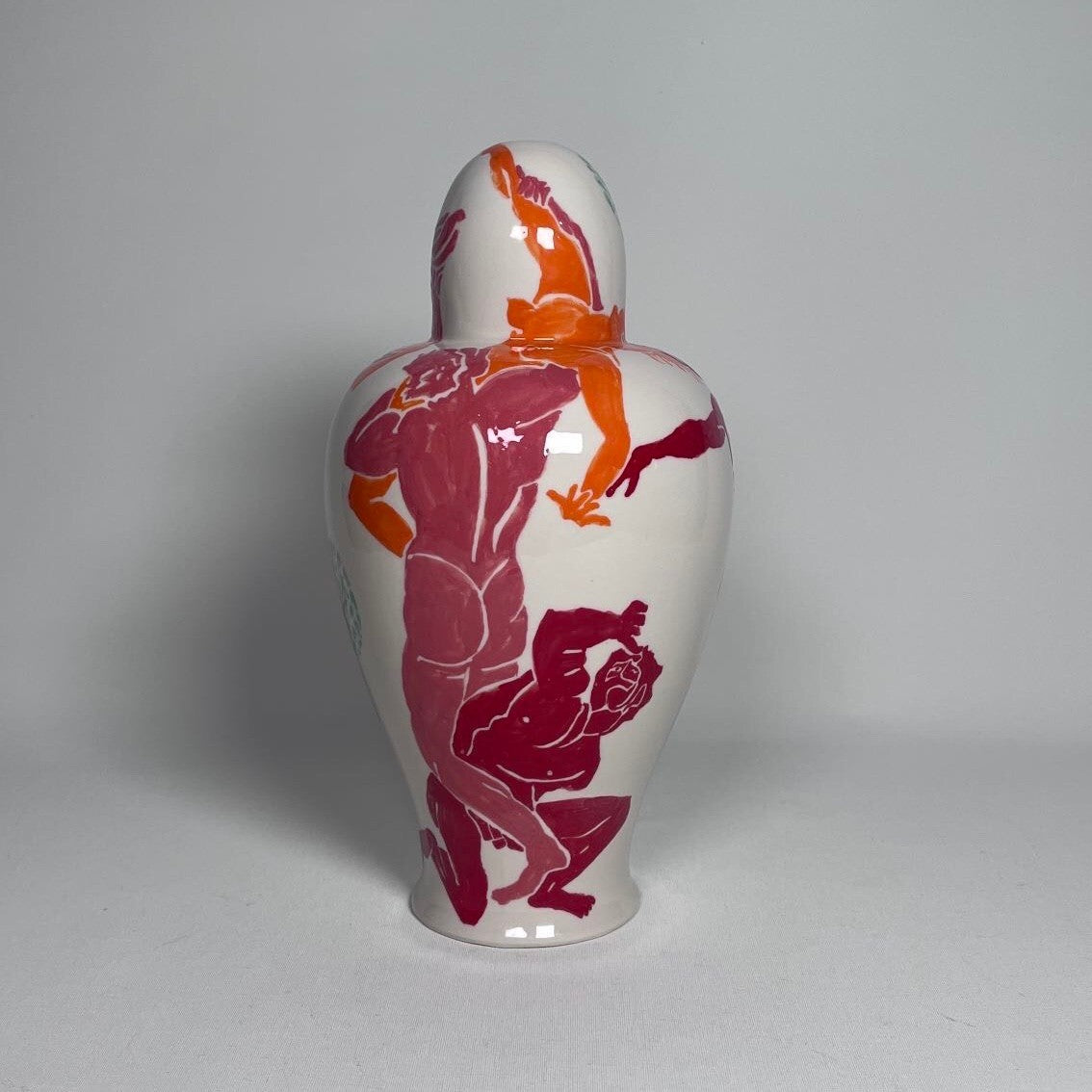 Oda al hedonismo, al color vibrante y sinuoso, a la homoerótica de los vasos griegos y a su lúdica gráfica con una escenografía organizada de manera que permiten su lectura girando la pieza y hablando por si misma.