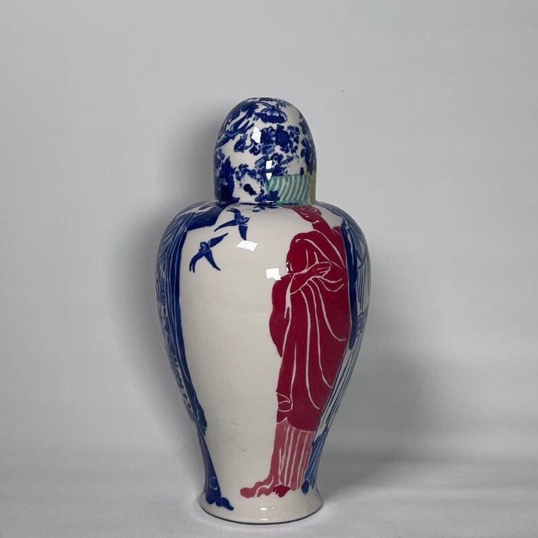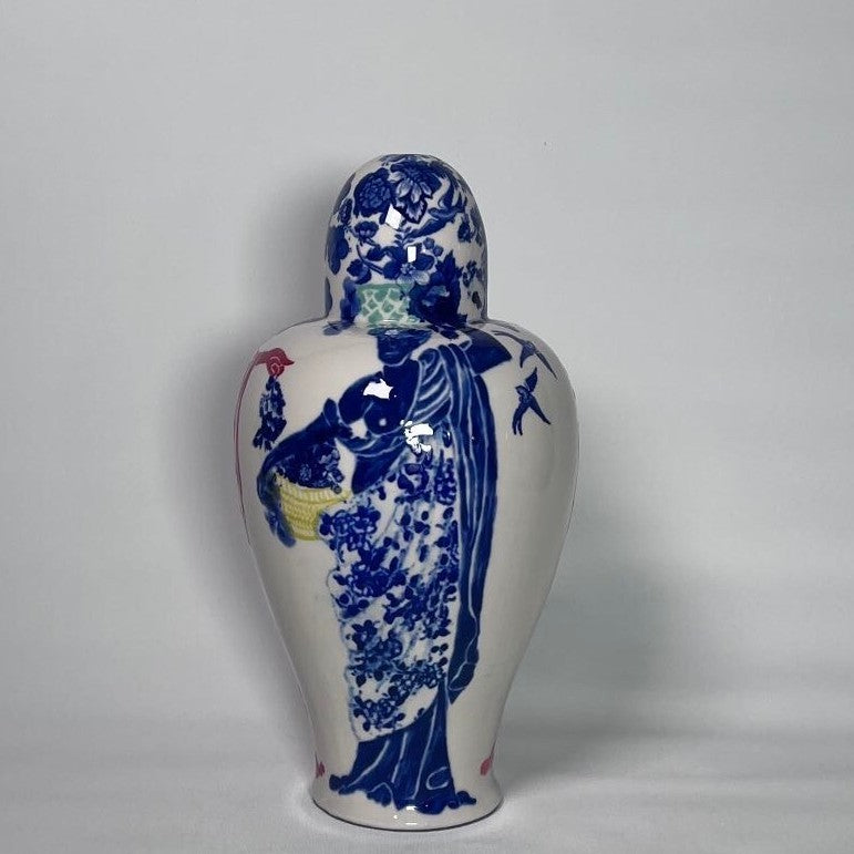 27 x 14 x 14 cm., porcelana por colada, engobes y esmalte transparente brillante.