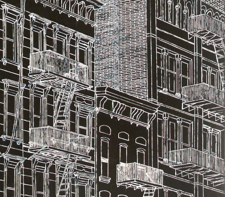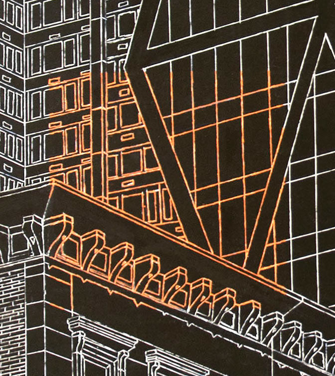 El primer plano muestra una arquitectura de los años 30, con sus volutas clásicas y elegancia ornamental. En el segundo, la verticalidad y el vidrio de los 2000. Y al fondo, las líneas rotundas de los años 70, con sus estructuras de acero y hormigón. Juntas, sin jerarquías ni profundidad, conforman una composición donde el tiempo colapsa, y la distancia focal desaparece.