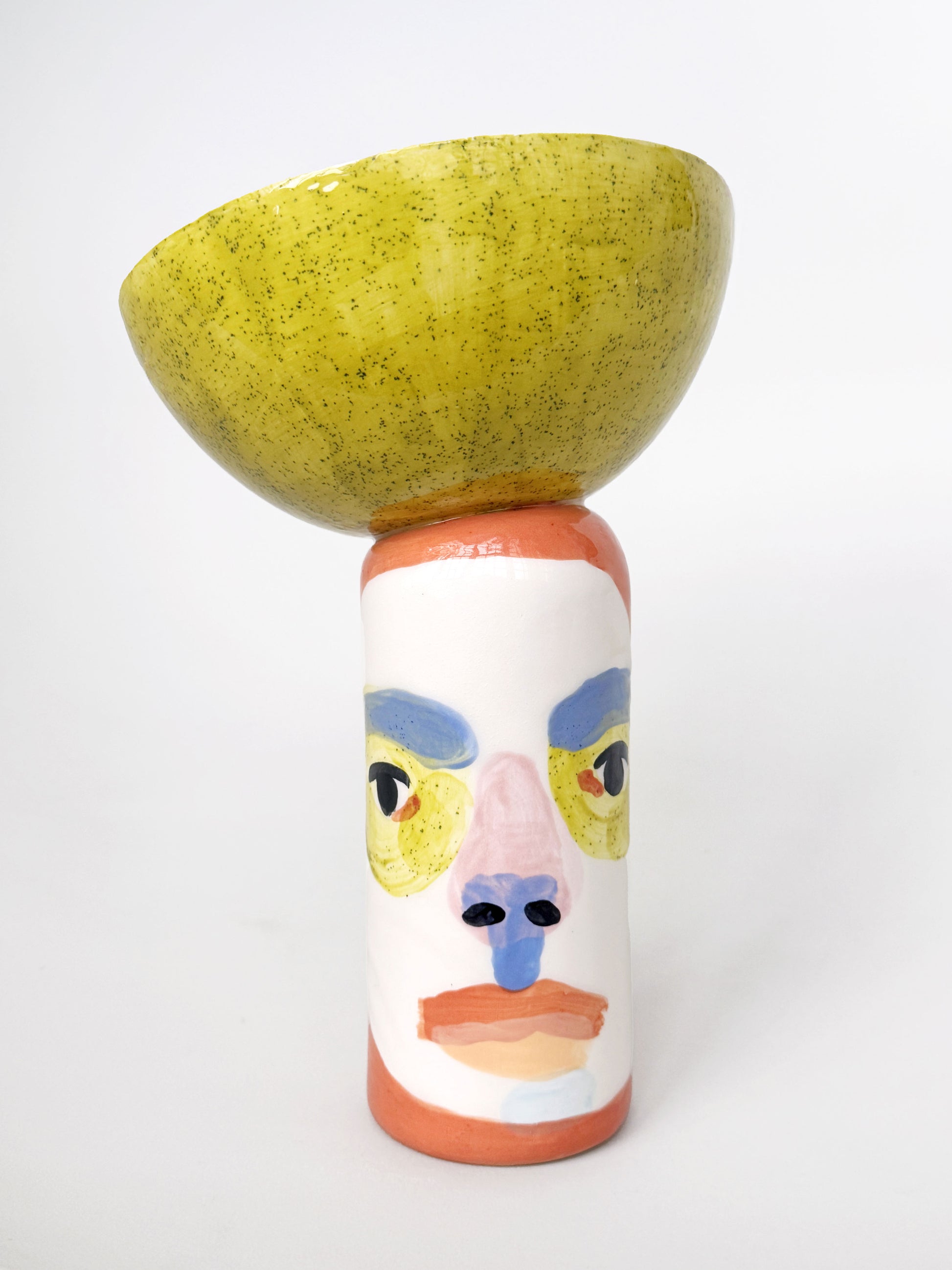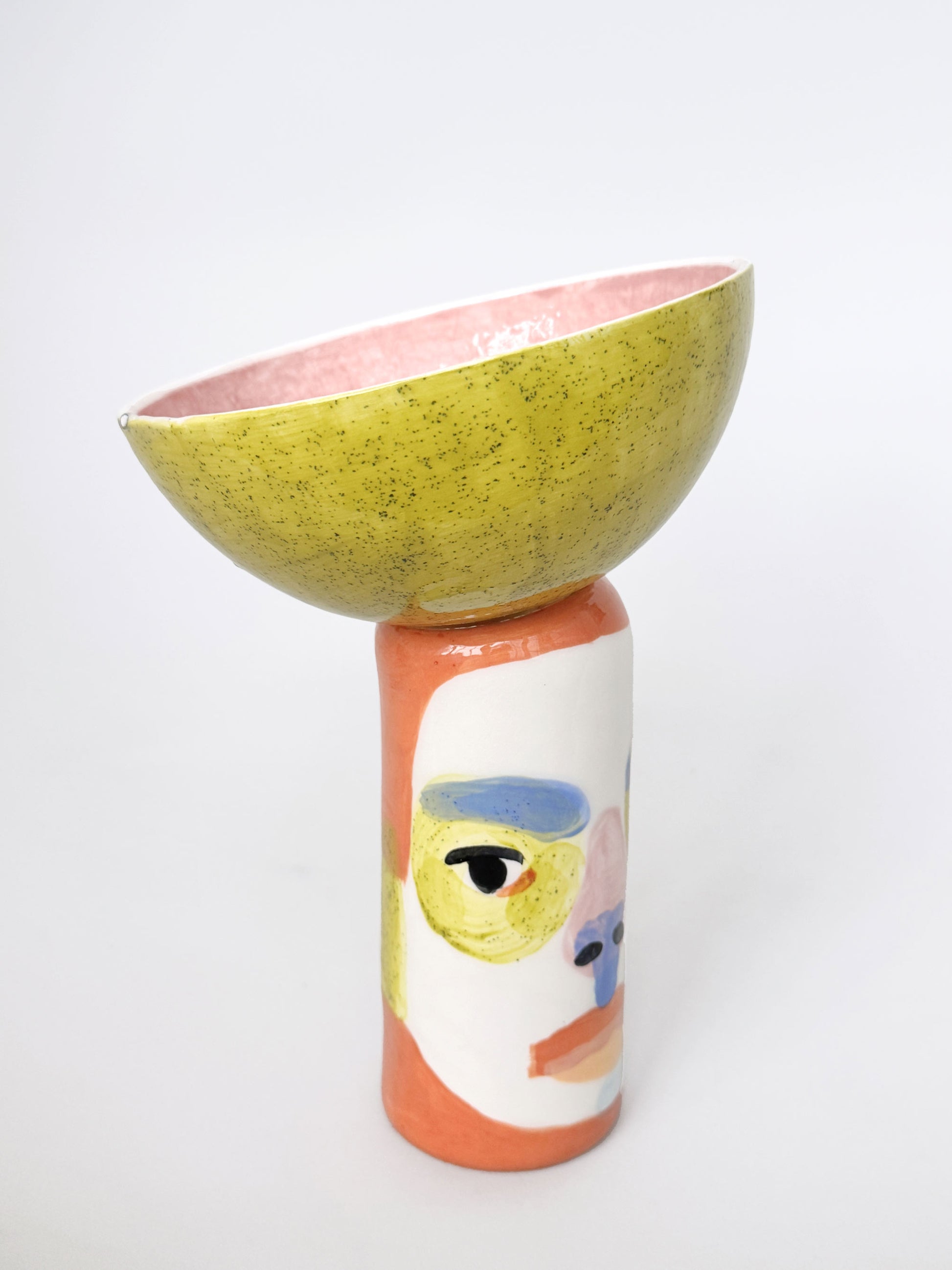 Todas las creaciones de SABADO son piezas únicas. Natalia comienza el proceso de ensamblaje de piezas para los jarrones con colada de arcilla blanca de forma totalmente artesanal. Una vez que las piezas han superado el secado, se realiza una primera cocción o bizcochado. Inés pinta a mano cada máscara o jarrón. Usando engobes de colores y esmaltes con efectos, dando vida a cada personaje. El proceso finaliza con el esmaltado y cocción en horno en su propio taller.