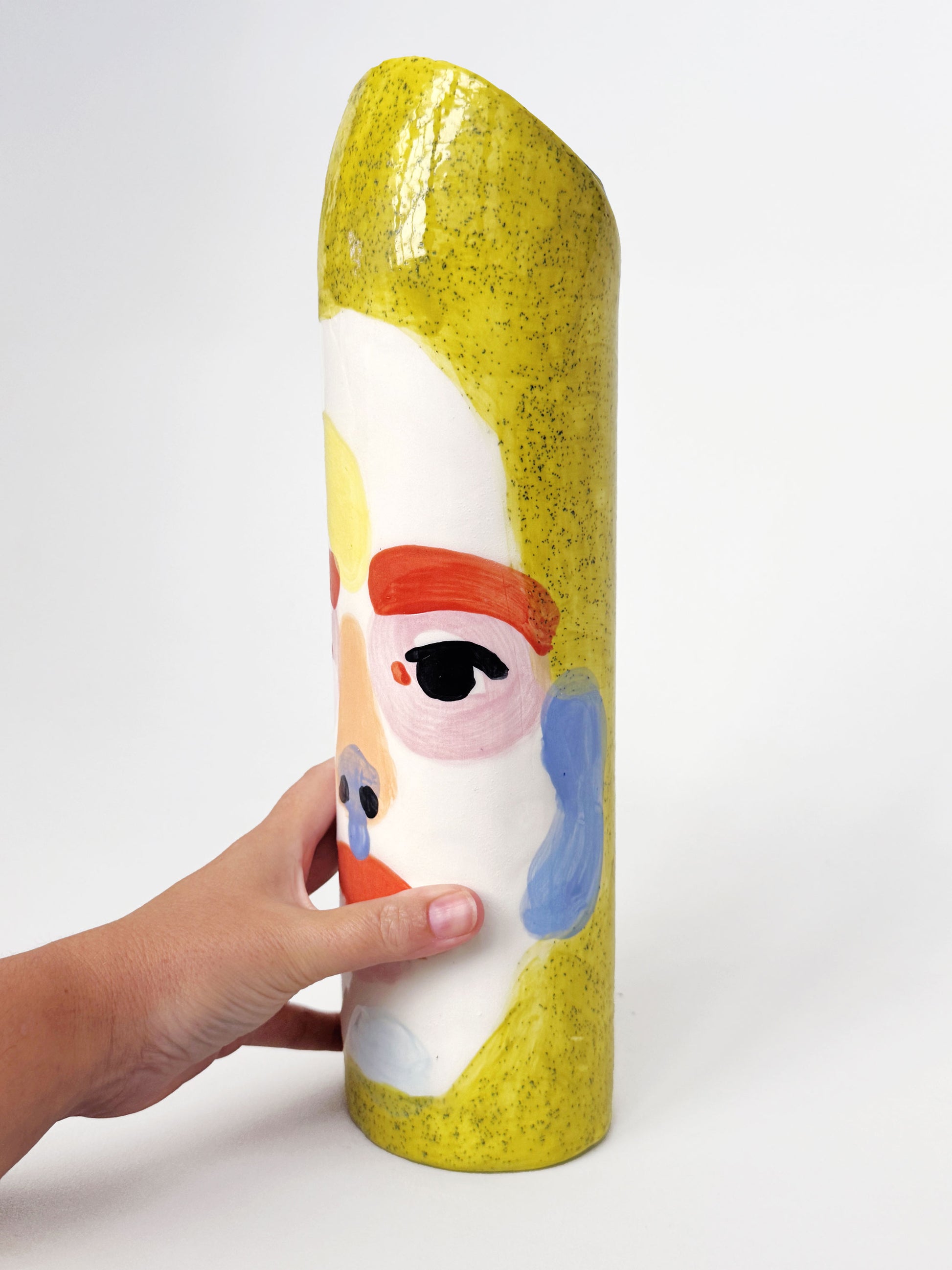 Todas las creaciones de SABADO son piezas únicas. Natalia comienza el proceso de ensamblaje de piezas para los jarrones con colada de arcilla blanca de forma totalmente artesanal. Una vez que las piezas han superado el secado, se realiza una primera cocción o bizcochado. Inés pinta a mano cada máscara o jarrón. Usando engobes de colores y esmaltes con efectos, dando vida a cada personaje. El proceso finaliza con el esmaltado y cocción en horno en su propio taller.