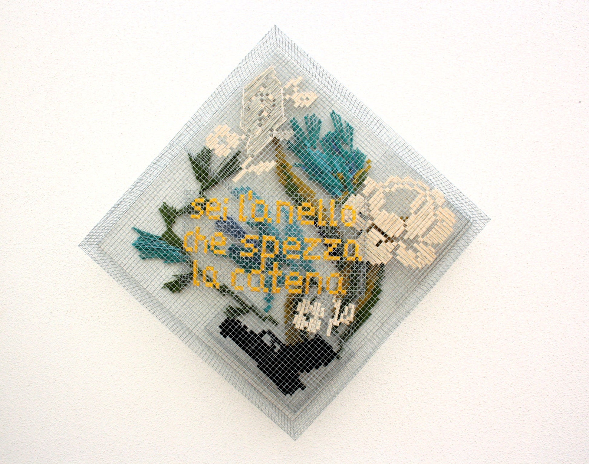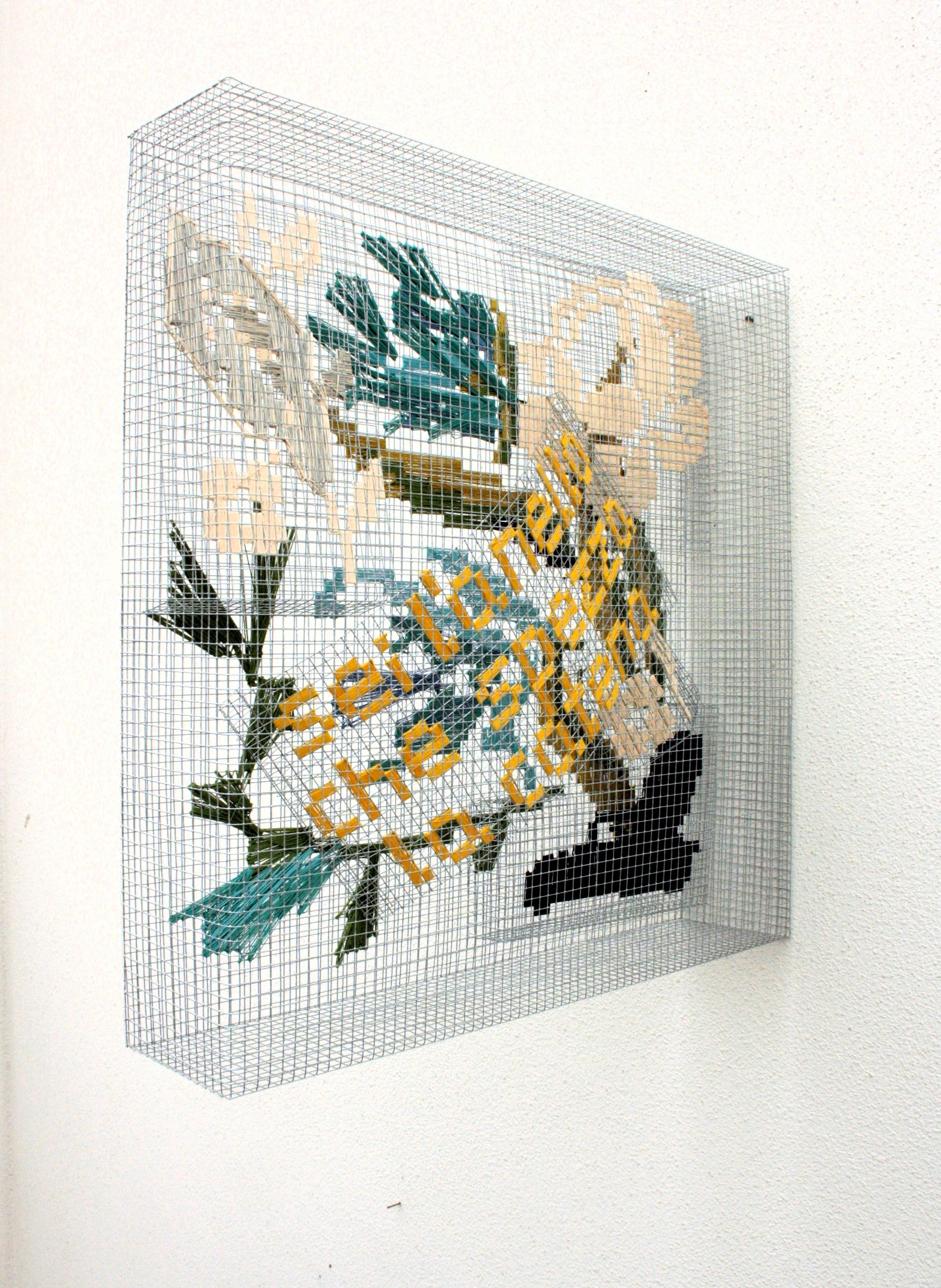 Série de gaiolas para pensamentos, 61 x 61 x 10 cm, malha metálica e fio de algodão.