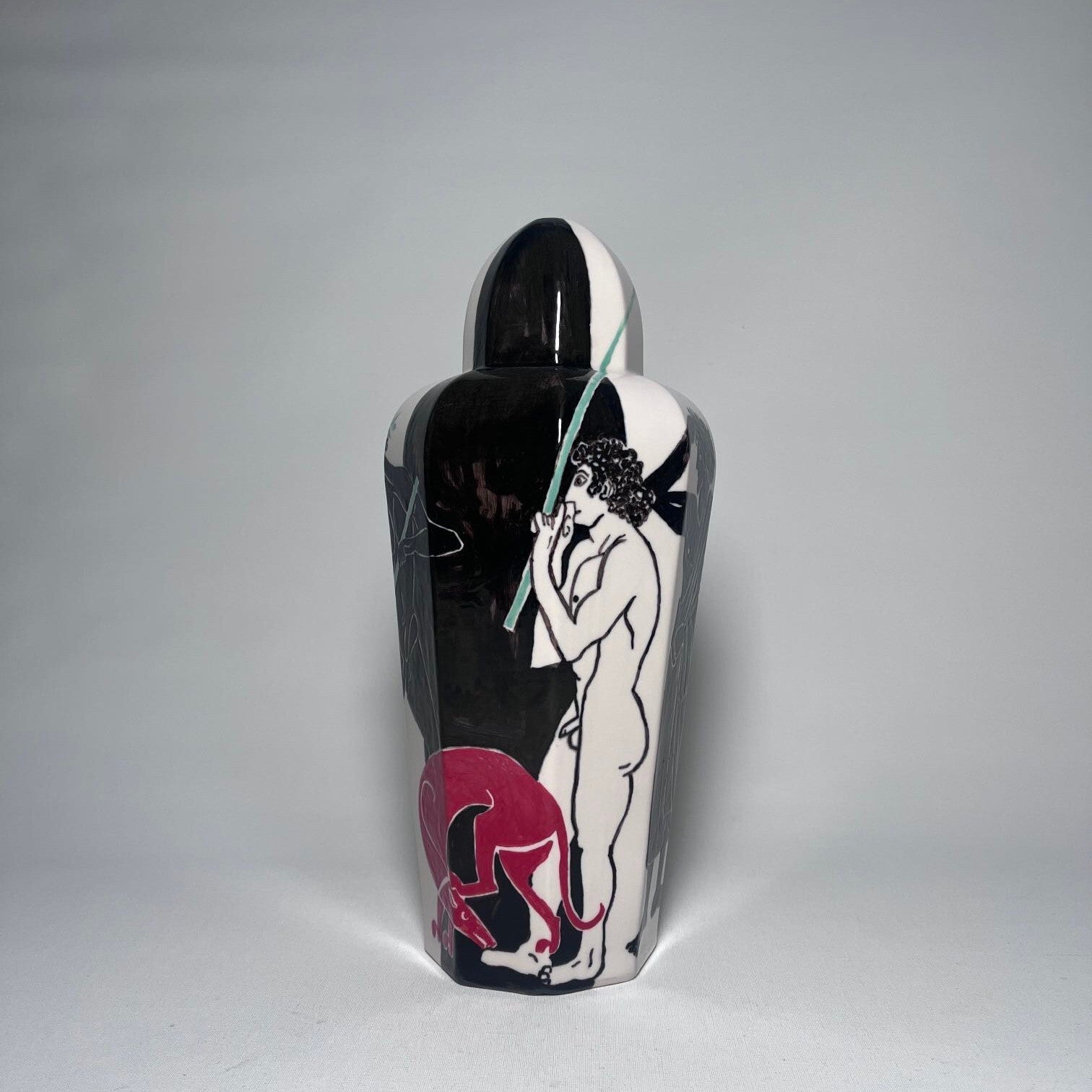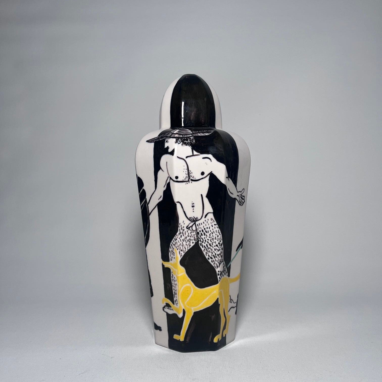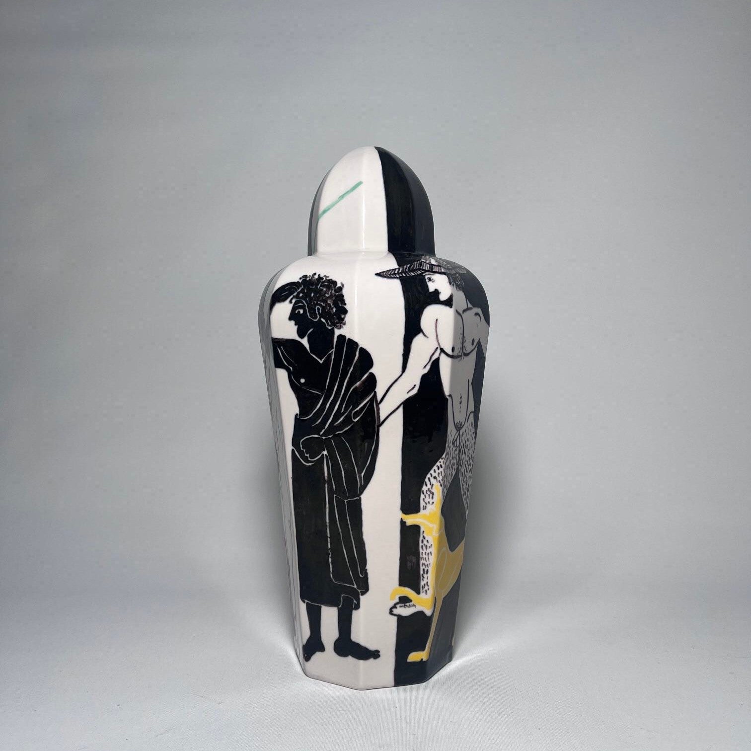 29 x 13 x 13 cm, porcelana fundida, barbotinas e esmalte transparente brilhante.