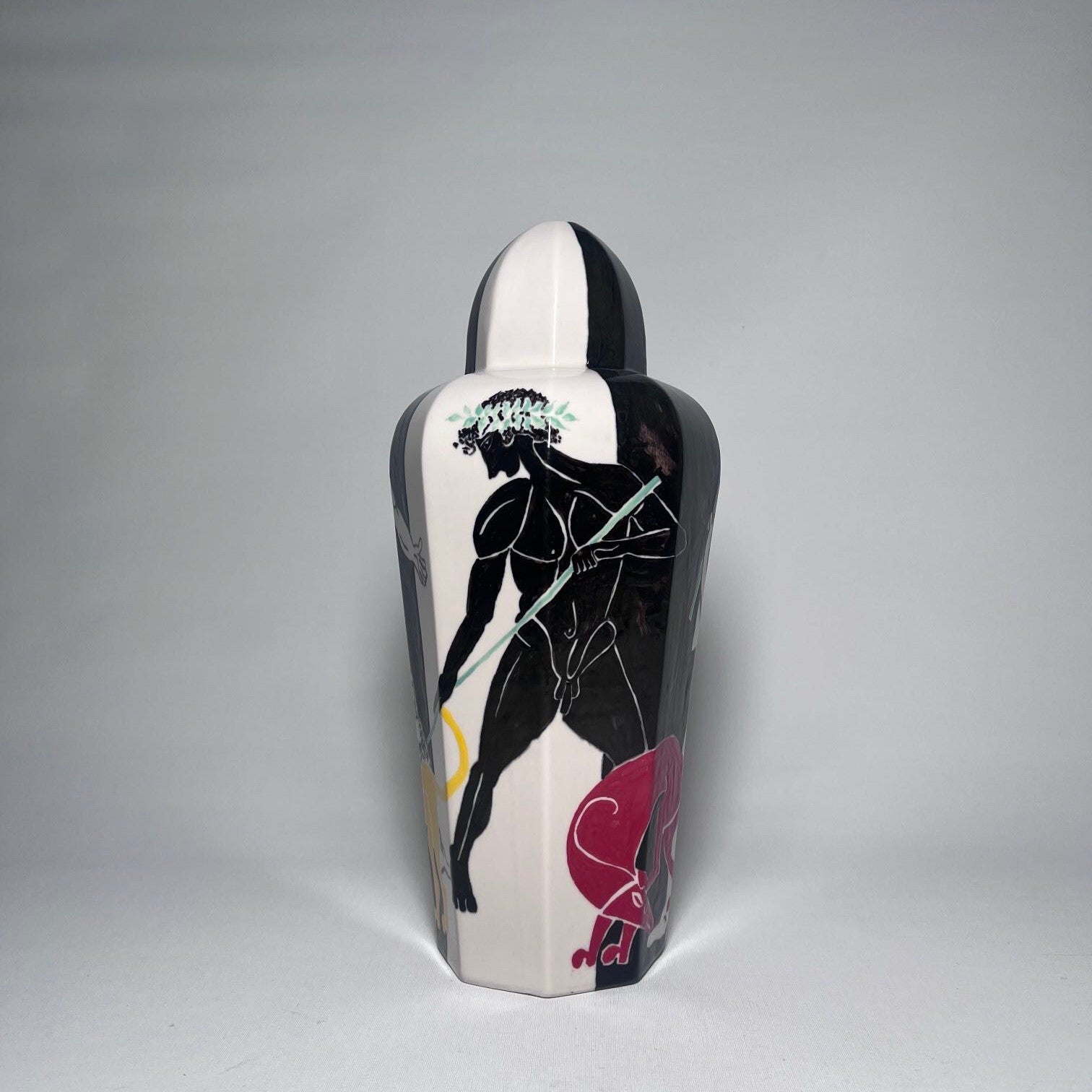 Uma ode ao hedonismo, à cor vibrante e sinuosa, ao homoerotismo dos vasos gregos e aos seus grafismos lúdicos, com um cenário organizado de tal forma que pode ser lido rodando a peça e falando por si.